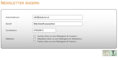 Wenn Sie auf den Menüpunkt „Newsletter“->“Neu“ klicken, kommen Sie in die Bearbeitungsansicht des neu angelegten Newsletters. Im oberen Bereich können Sie die Grunddaten des Newsletters bearbeiten und den Newsletter entsprechenden Maillisten zuweisen.