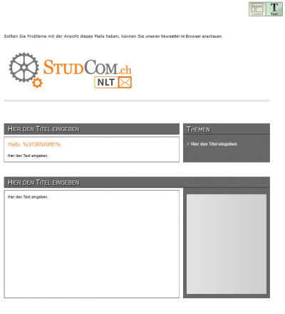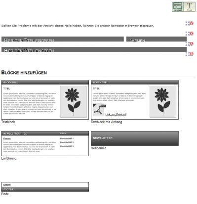Im unteren Bereich haben Sie die Auswahl zwischen zwei Ansichten des Newsletters (Textansicht & Layout Ansicht). In der Textansicht können Sie den Inhalt der einzelnen Blöcke bearbeiten. |